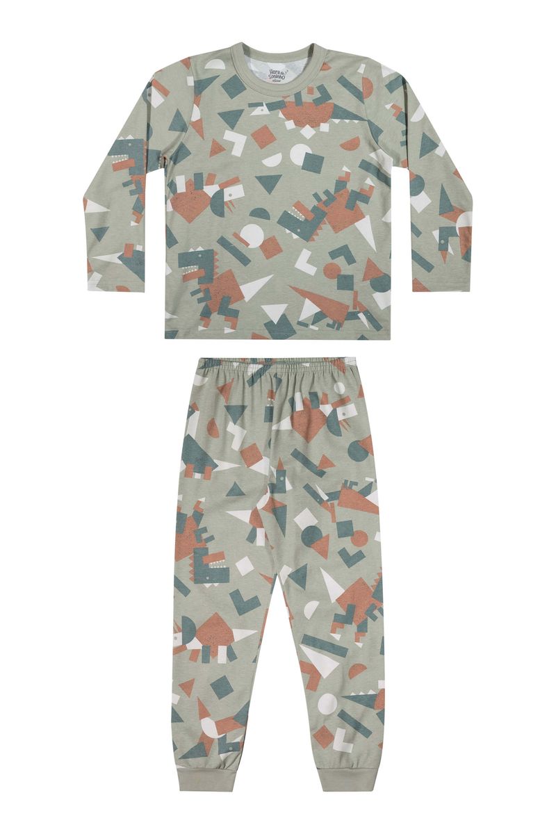 • Pijama composto por camiseta e calça • Mangas longas • Feito em meia malha • Estampa geométrica de dinossauros • Detalhes que brilham no escuro • Elástico no cós e punhos