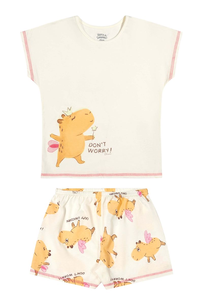 • Pijama composto por blusa e short • Feito em meia malha • Estampa com capivaras e glitter • Detalhes que brilham no escuro • Elástico no cós