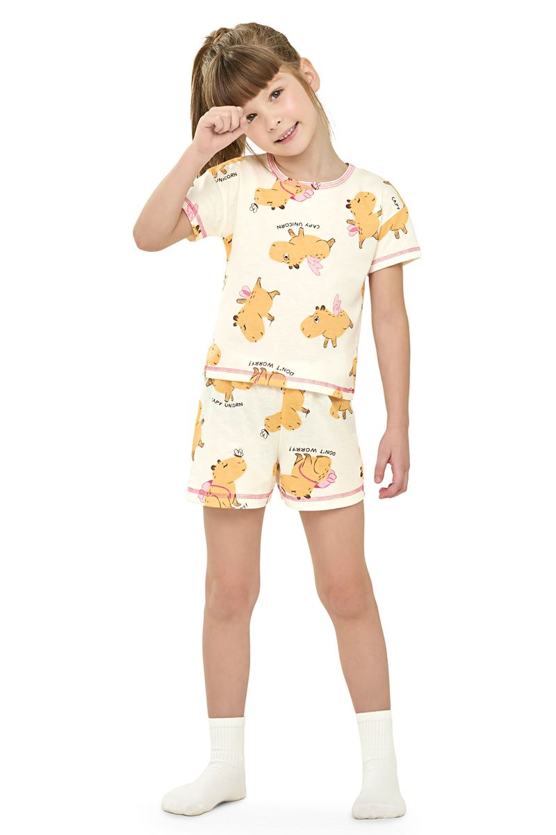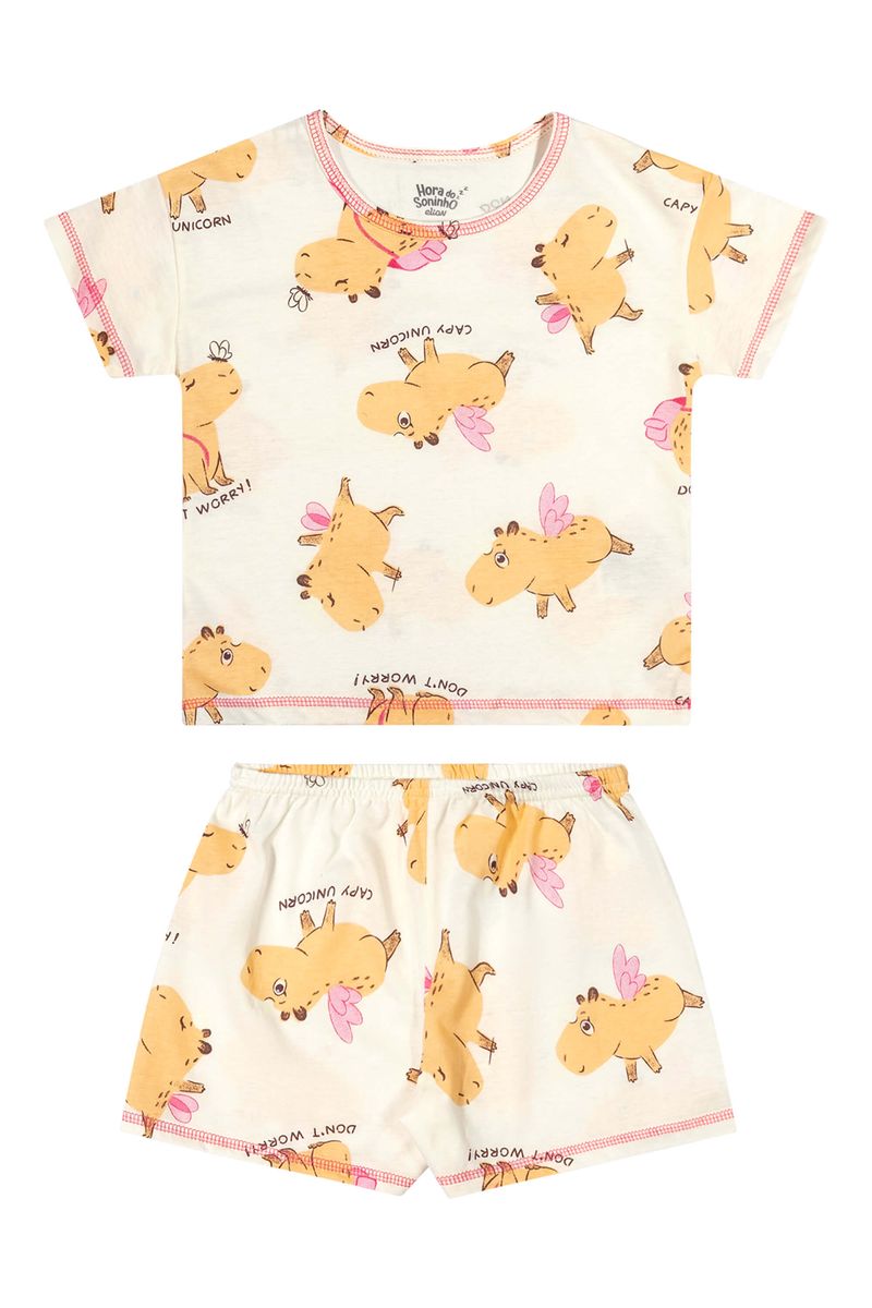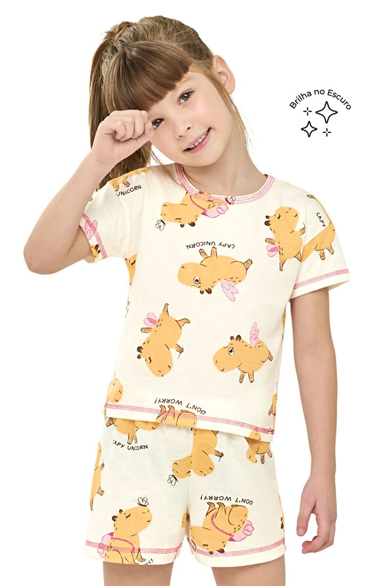 • Pijama composto por blusa e short • Feito em meia malha • Estampa com capivaras • Detalhes que brilham no escuro • Elástico no cós