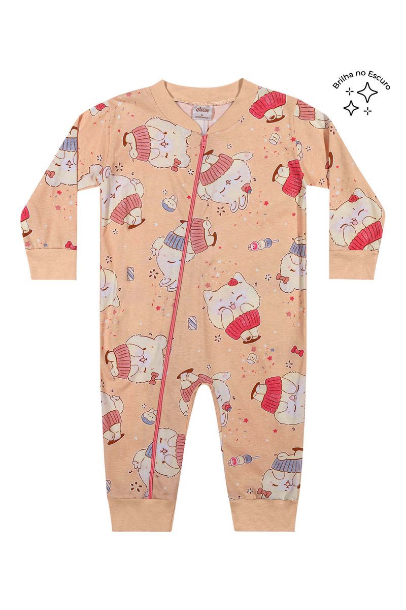 • Feito em meia malha • Possui mangas longas • Estampa de bichinhos • Abertura frontal em zíper • Detalhes que brilham no escuro