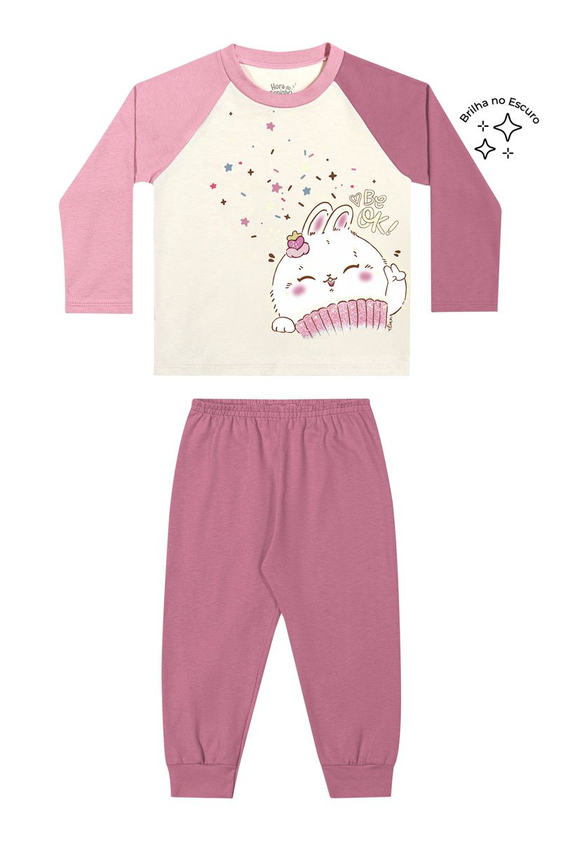 • Pijama composto por blusa e calça • Feito em meia malha • Possui mangas longas raglan • Estampa de coelhinho com glitter • Elástico no cós • Detalhes que brilham no escuro