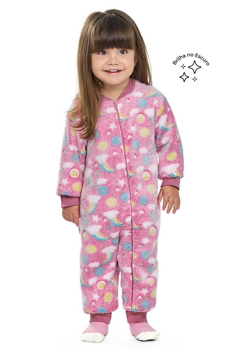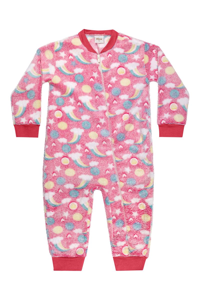 • Feito em pelo • Possui mangas longas • Estampa de arco-íris, corações e bolinhas • Abertura em zíper • Detalhes que brilham no escuro