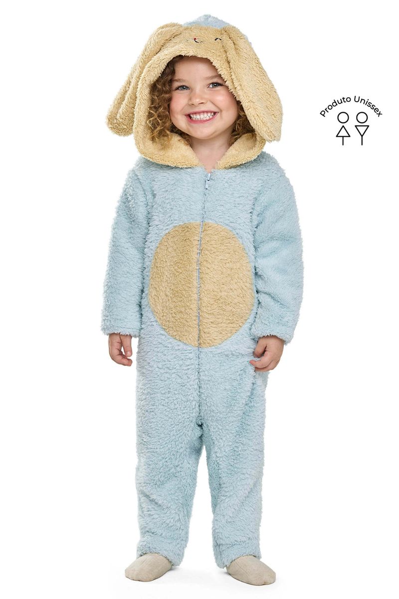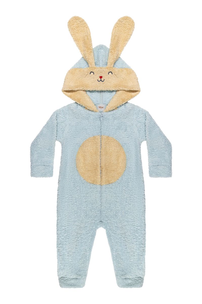 • Feito em pelo • Possui mangas longas • Abertura frontal em zíper • Possui capuz lúdico imitando coelho