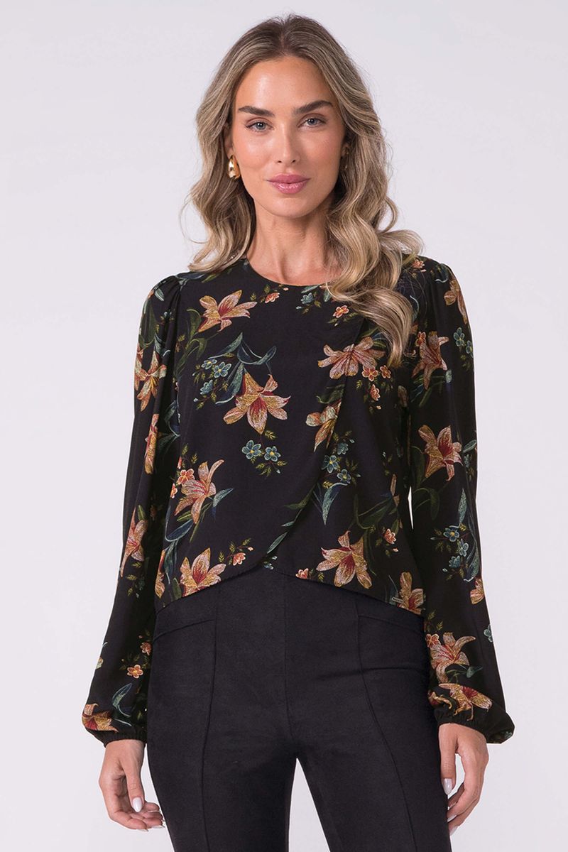AdultoFemininoBlusas FemininoBlusa Feminina Manga Longa Transpassada Floral Marialícia Preto