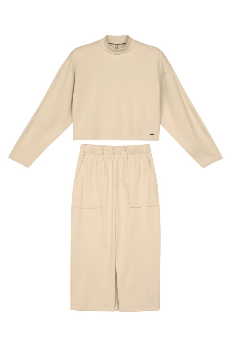 Conjunto Feminino Blusão e Saia Midi Moletom Marialícia Bege REF: 183914-2057