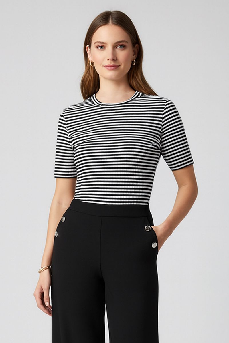 • Feita em canelado listrado • Possui mangas curtas até o cotovelo • Possui comprimento regular • Possui gola alta • Possui modelagem ajustada • Ideal para usar com tênis ou sandálias