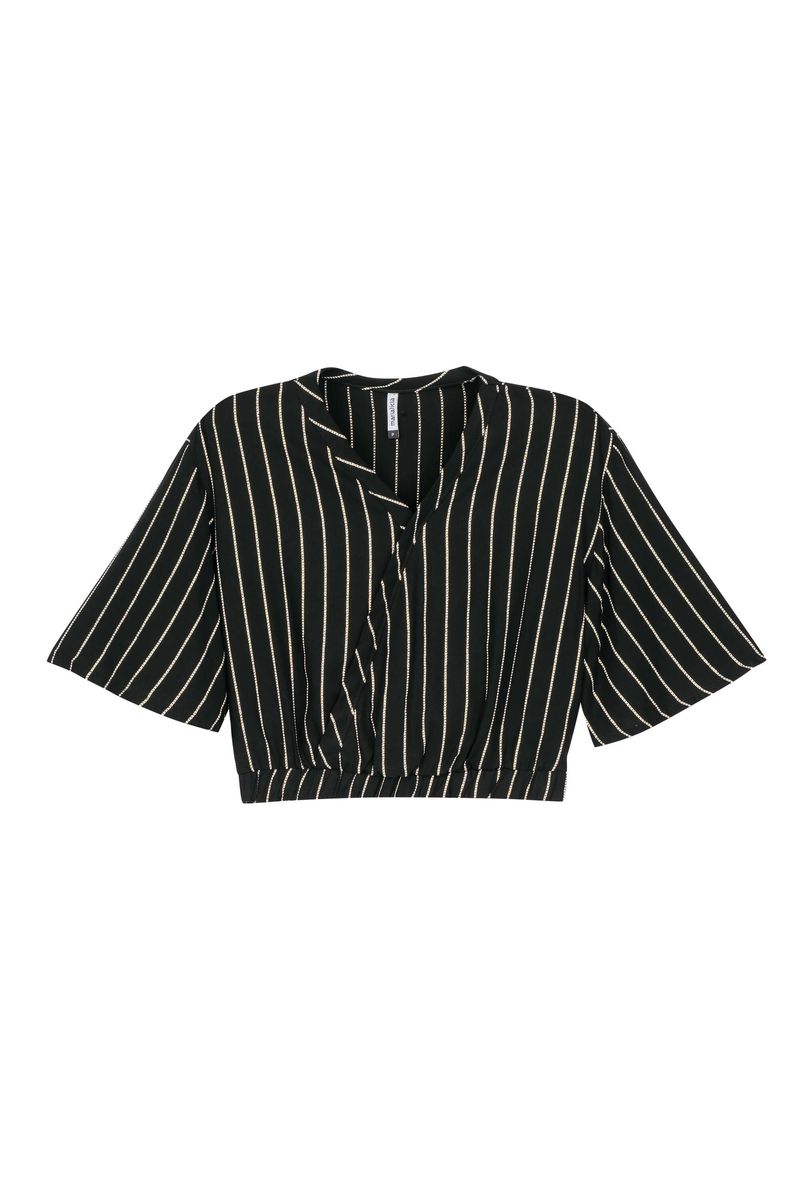 • Feito em tecido de viscose lurex • Possui comprimento cropped • Possui mangas curtas amplas • Possui estampa listrada • Possui decote V com transpasse • Ideal para ir do trabalho ao happy hour