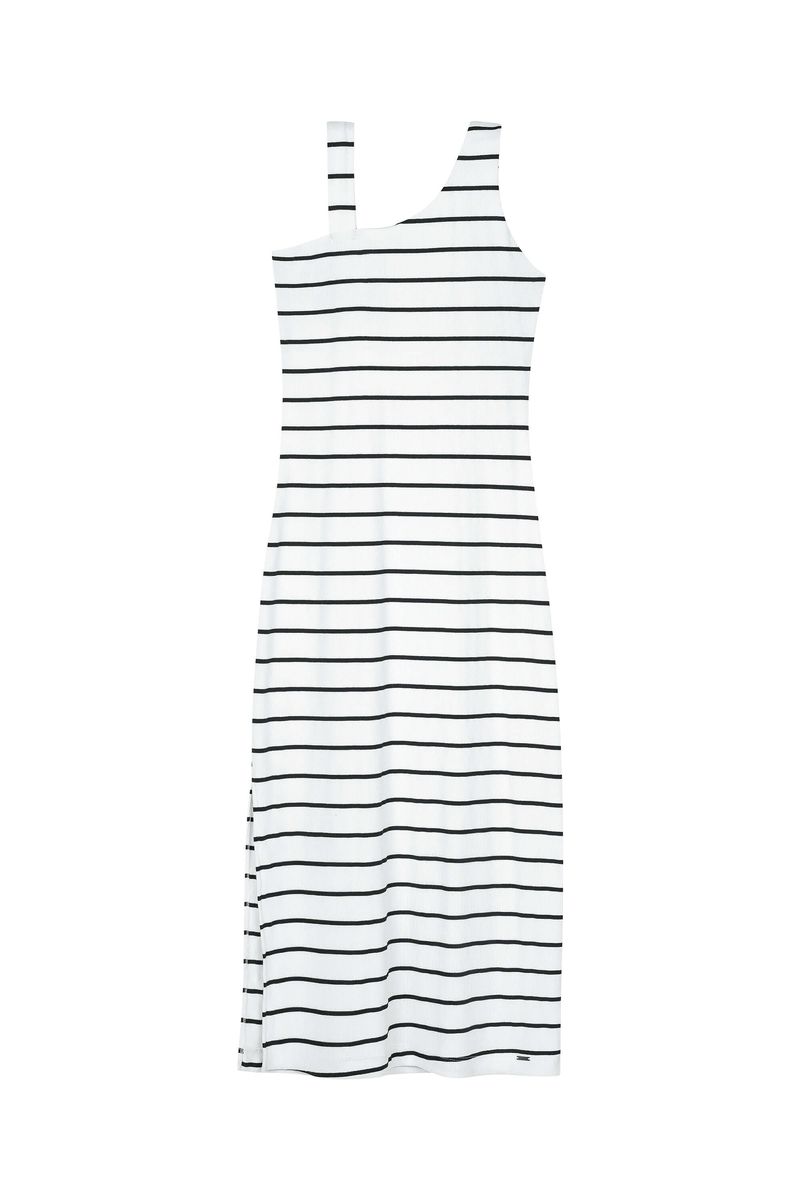 • Feita em malha canelada listrada • Possui comprimento midi • Possui decote assimétrico com alça • Possui abertura lateral tipo fenda • Ideal para passeios e encontros especiais