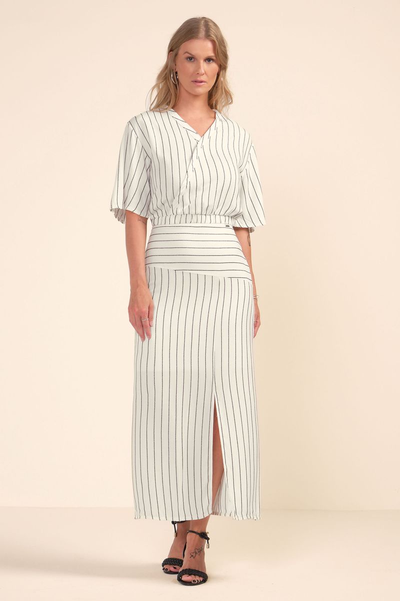 • Feito em tecido de viscose lurex • Possui comprimento midi • Possui fechamento em zíper • Possui estampa listrada • Possui detalhe com fenda • Possui forro • Ideal para um office look