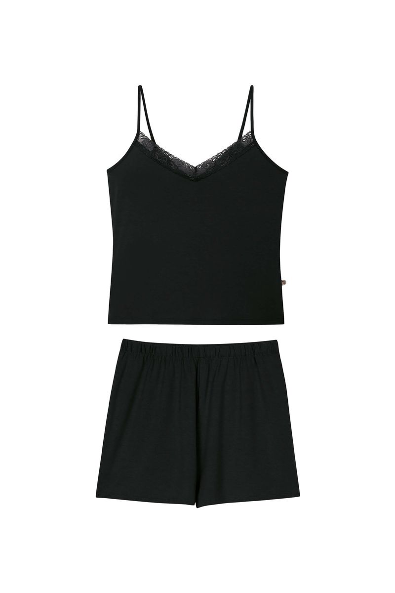• Composto por regata e short • Feito em malha de viscose • Possui comprimento regular • Possui alças • Possui decote V com renda • Possui elástico no cós