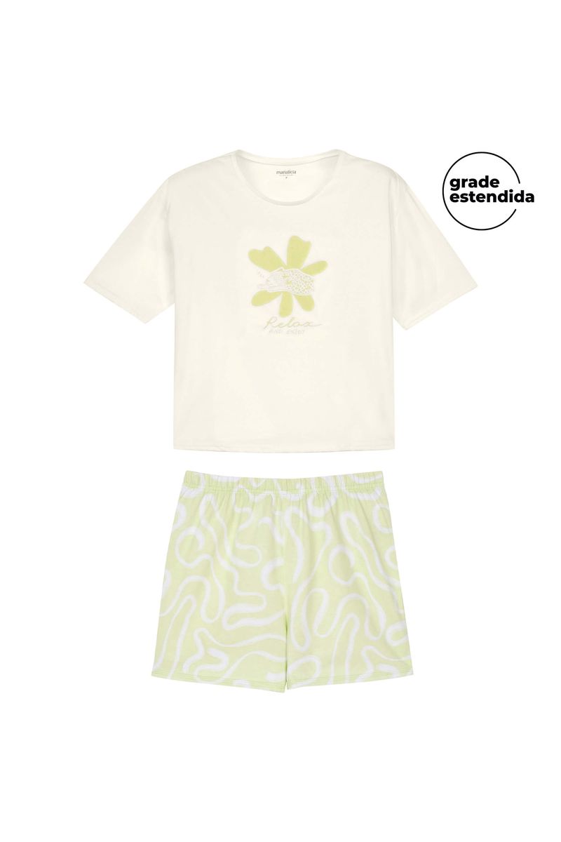 • Composto por blusa e short • Feito em meia malha • Possui comprimento regular • Possui mangas curtas • Possui estampa • Possui elástico no cós