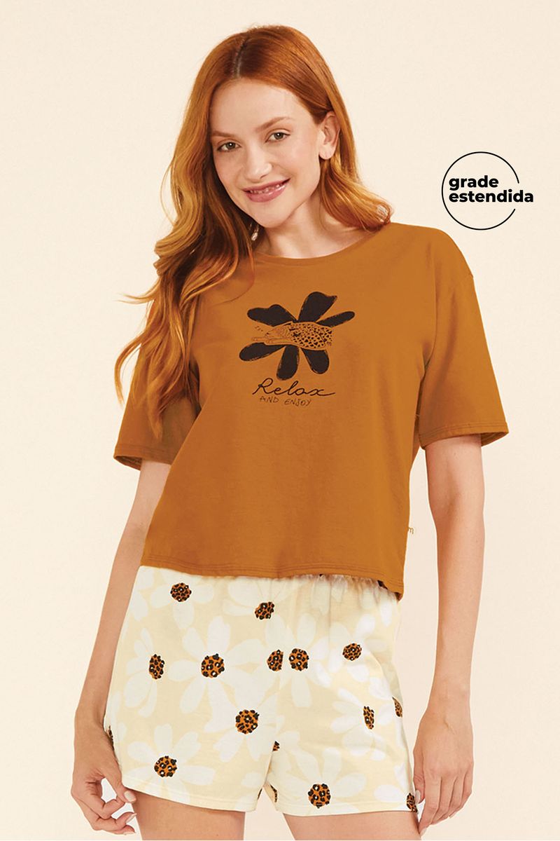 • Composto por blusa e short • Feito em meia malha • Possui comprimento regular • Possui mangas curtas • Possui estampa • Possui elástico no cós
