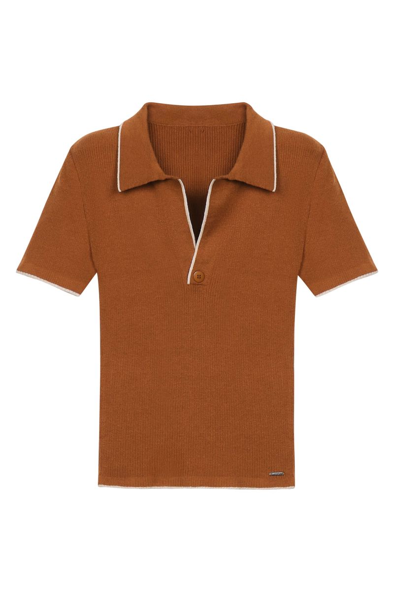 • Feita em tricô • Comprimento regular • Possui mangas curtas • Possui gola polo com detalhe em botão • Ideal para almoços ou produções mais arrumadas