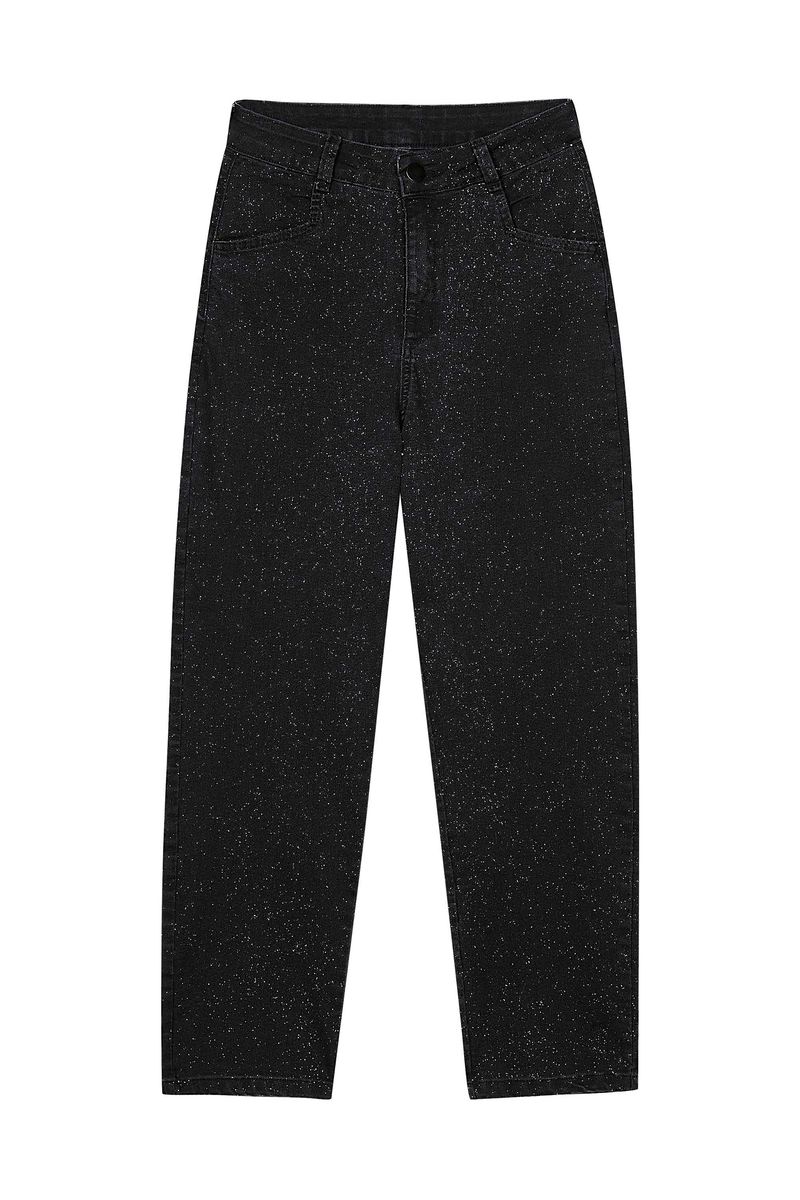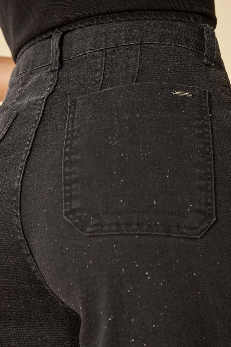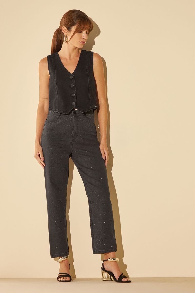 • Feita em jeans com elastano • Modelagem reta • Com tecnologia de compressão • Fechamento em botão e zíper • Possui bolsos • Possui detalhes em brilhos • Ideal para produções noturnas ou combinações mais estilosas