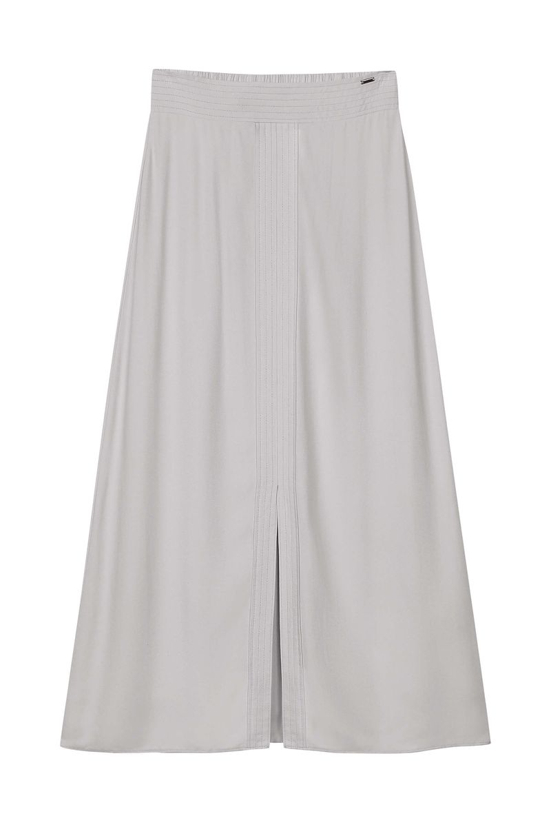 • Feita em tecido de viscose sarjada • Comprimento midi • Elástico no cós • Detalhe em fenda frontal • Ideal para um office look ou encontro com as amigas