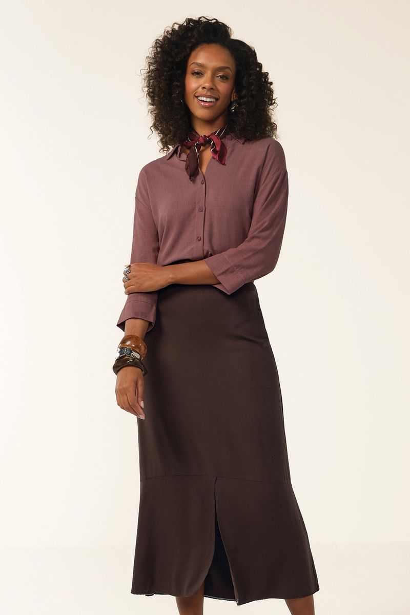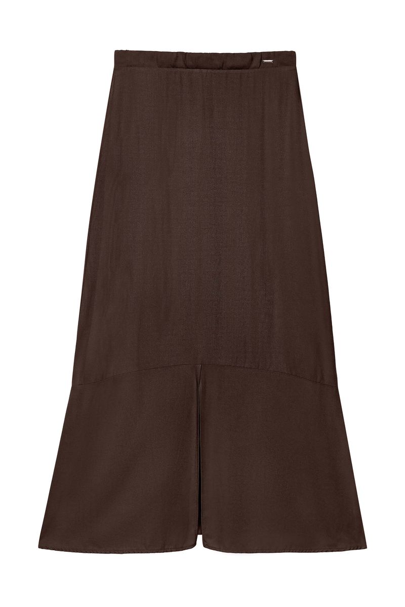 • Feita em tecido de viscose sarjada • Comprimento midi • Elástico na cintura • Recorte com fenda frontal • Ideal para trabalho ou passeios