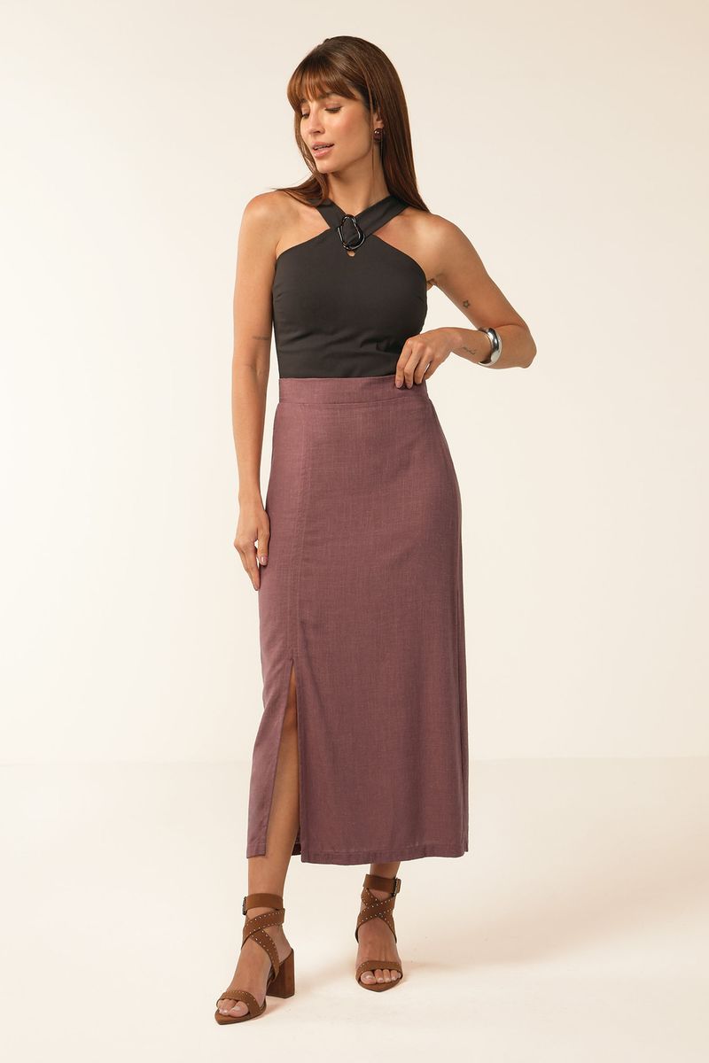 • Feita em tecido viscolinho • Comprimento midi • Elástico na cintura • Recorte com fenda lateral • Ideal para trabalho ou eventos informais