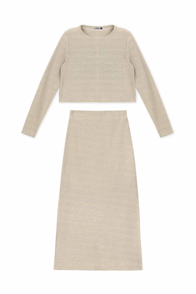 • Conjunto composto por blusa e saia • Feito em malha tricô linho • Comprimento cropped • Possui mangas longas • Elástico no cós • Aberturas laterais • Ideal para compromissos especiais, ambientes profissionais ou produções urbanas