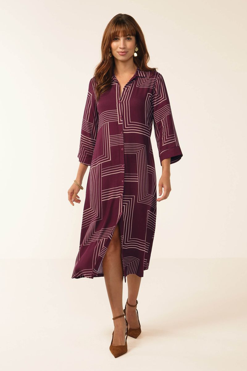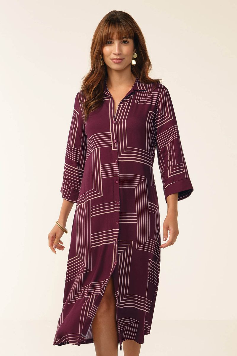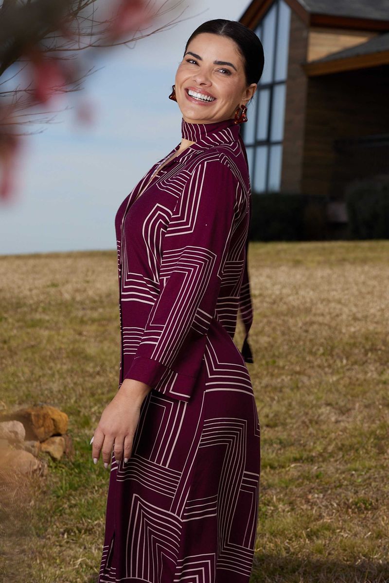 • Feito em tecido de viscose sarjada • Comprimento midi • Modelagem chemise com abertura em botões • Possui mangas 3/4 • Estampa geométrica • Acompanha faixa para amarração na cintura • Ideal para compromissos durante o dia e momentos descontraídos