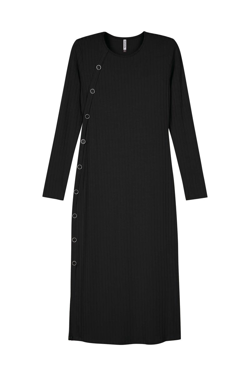 • Feito em canelado de viscose • Comprimento midi • Possui mangas longas • Possui detalhes em botões decorativos • Abertura lateral em fenda • Ideal para um office look ou eventos casuais