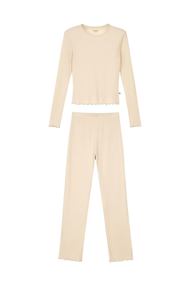 • Pijama composto por blusa e calça • Feito em malha canelada trabalhada • Comprimento intermediário • Possui mangas longas • Elástico no cós • Detalhe em frufru nos punhos, cintura e barras