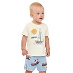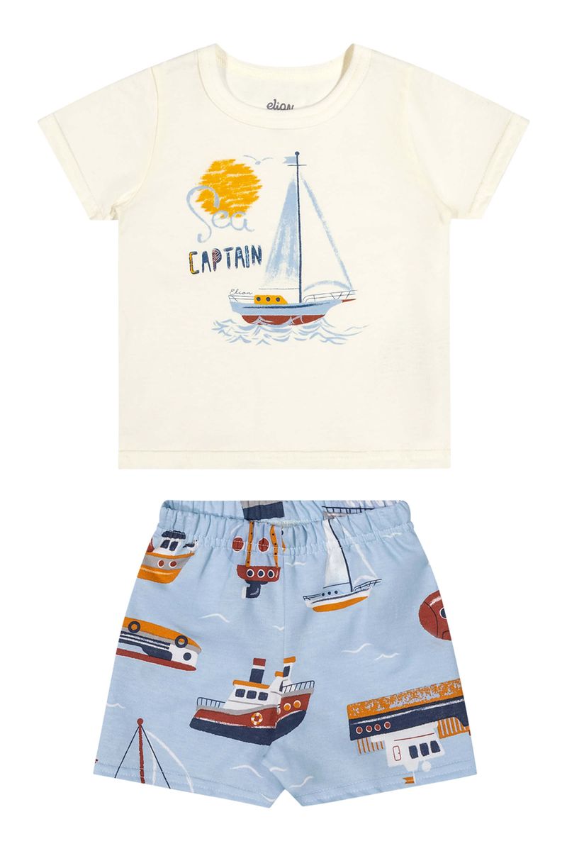 • Conjunto composto por camiseta e bermuda • Feito em meia malha e moletinho • Estampa de barquinhos • Elástico no cós • Ideal para momentos de lazer e aventuras