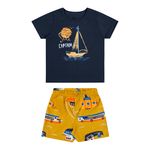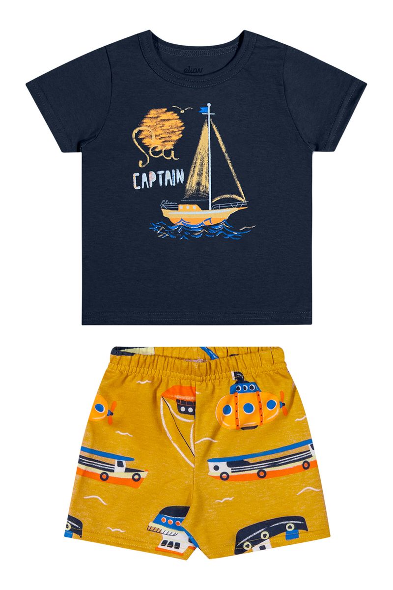 • Conjunto composto por camiseta e bermuda • Feito em meia malha e moletinho • Estampa de barquinhos • Elástico no cós • Ideal para momentos de lazer e aventuras