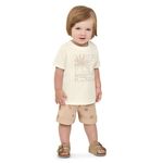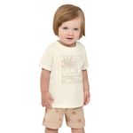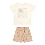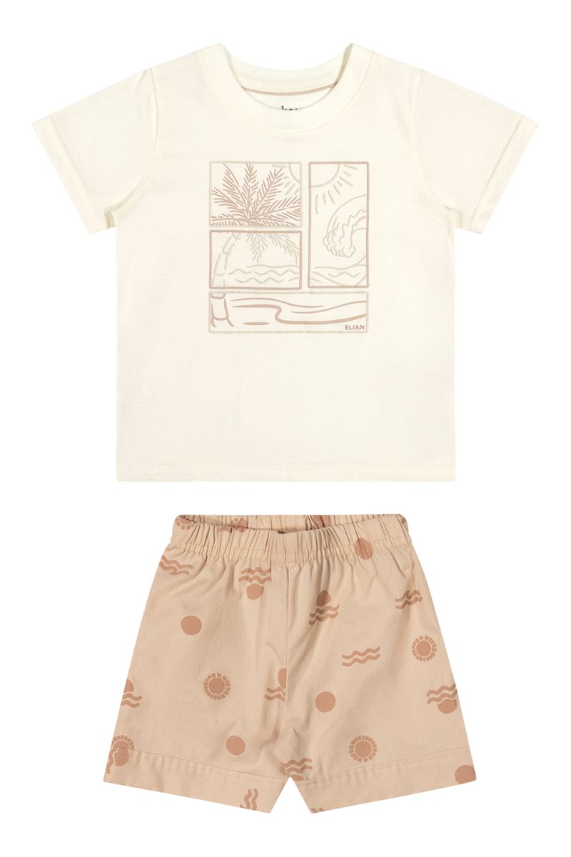 • Conjunto composto por camiseta e bermuda • Feito em meia malha e tecido tricoline com elastano • Estampa tropical minimalista • Detalhes em puff • Elástico no cós • Ideal para passeios e momentos especiais