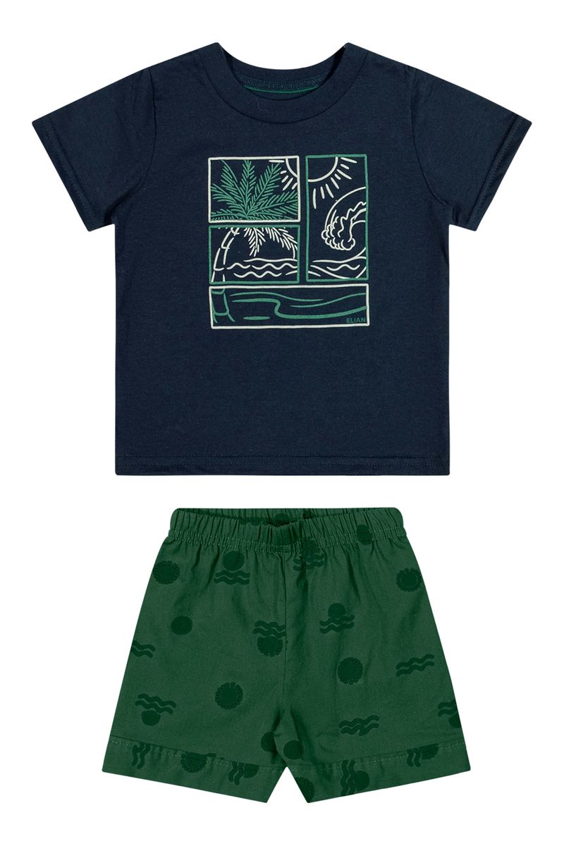 • Conjunto composto por camiseta e bermuda • Feito em meia malha e tecido tricoline com elastano • Estampa tropical minimalista • Detalhes em puff • Elástico no cós • Ideal para passeios e momentos especiais