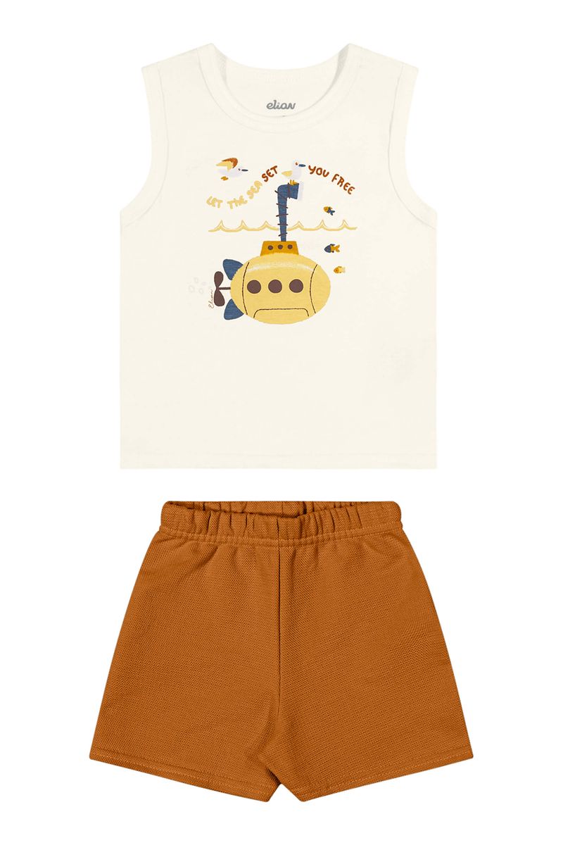 • Conjunto composto por regata e bermuda • Feito em meia malha e moletinho texturizado • Estampa de submarino • Elástico no cós • Ideal para dias de sol