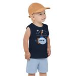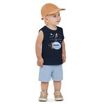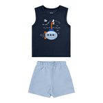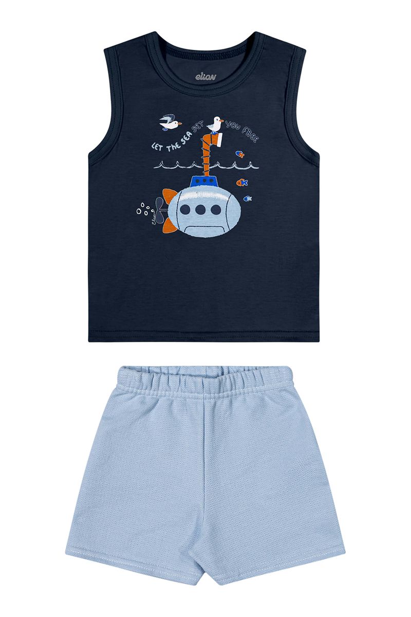 • Conjunto composto por regata e bermuda • Feito em meia malha e moletinho texturizado • Estampa de submarino • Elástico no cós • Ideal para dias de sol