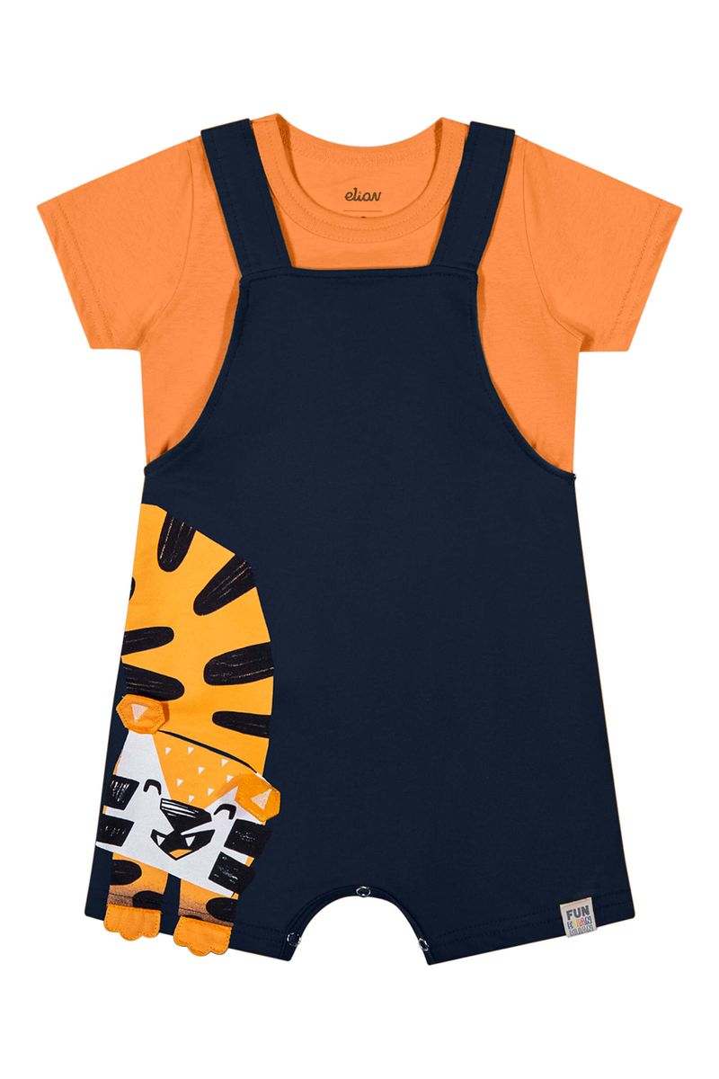 • Conjunto composto por camiseta e jardineira • Feito em meia malha e moletinho • Camiseta básica de manga curta • Jardineira com alças • Estampa de tigre com bordados • Possui fechamento em botões de pressão no entrepernas • Ideal para explorar o mundo