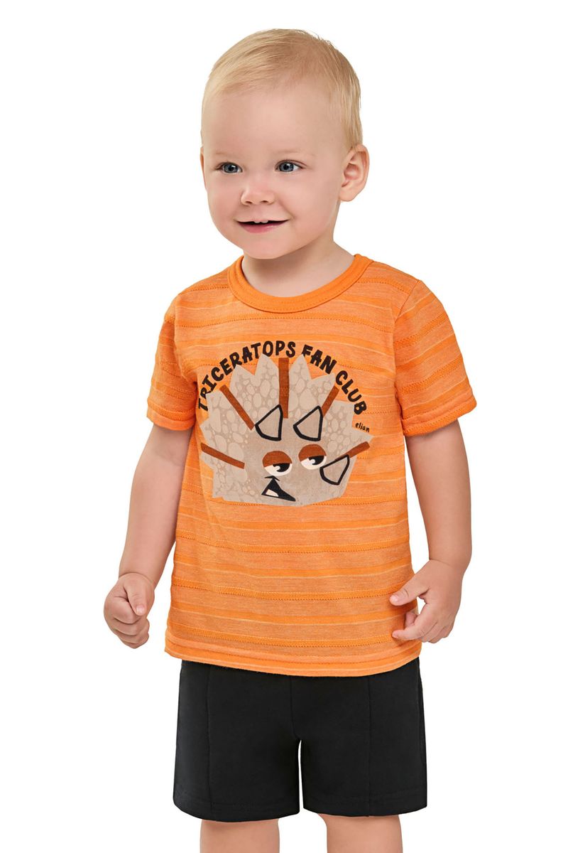 • Conjunto composto por camiseta e bermuda • Feito em malha rajada e moletinho • Estampa de dinossauros • Elástico no cós • Ideal para brincadeiras e aventuras