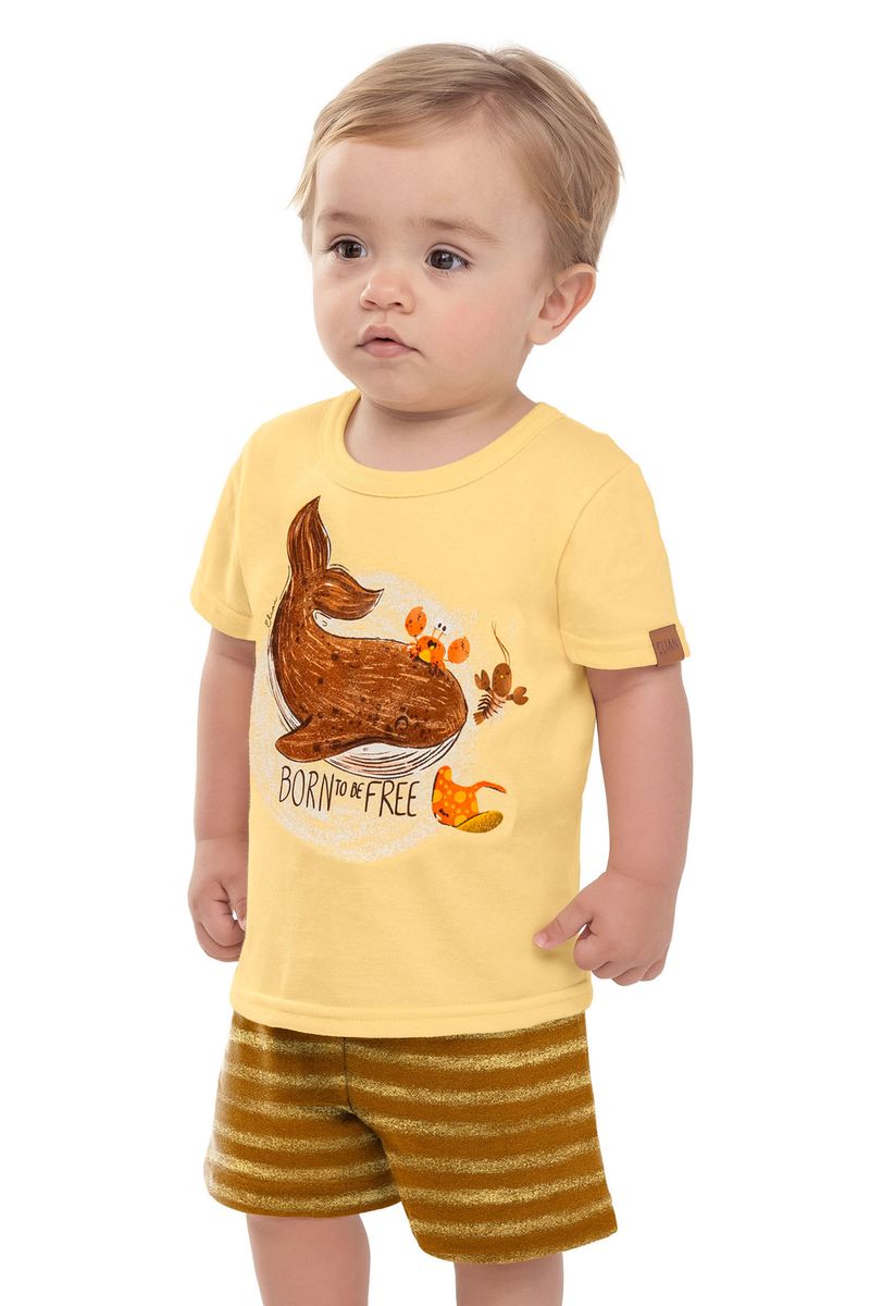 • Conjunto composto por camiseta e bermuda • Feito em meia malha e moletom sem felpa • Possui mangas curtas • Possui estampa com animais marinhos • Possui elástico no cós • Ideal para momentos de lazer e passeios
