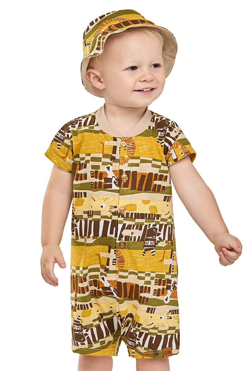 • Feito em malha flamê • Abertura em botões e botões de pressão • Estampa com temática de safári • Acompanha chapéu • Ideal para passeios em família e momentos divertidos