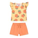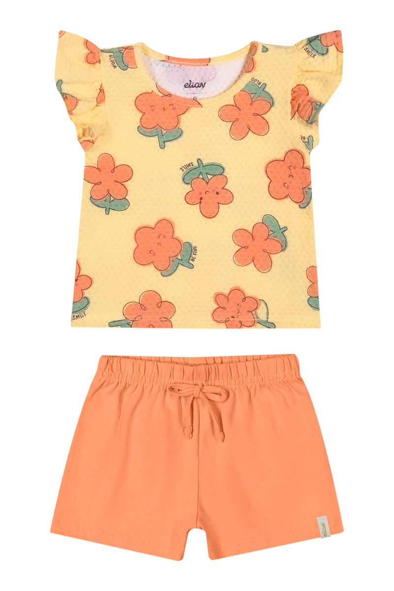 • Conjunto composto por blusa e short • Feito em cotton leve • Possui mangas curtas franzidas • Possui estampa de florzinhas • Possui elástico no cós • Ideal para passeios e dia a dia