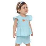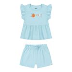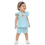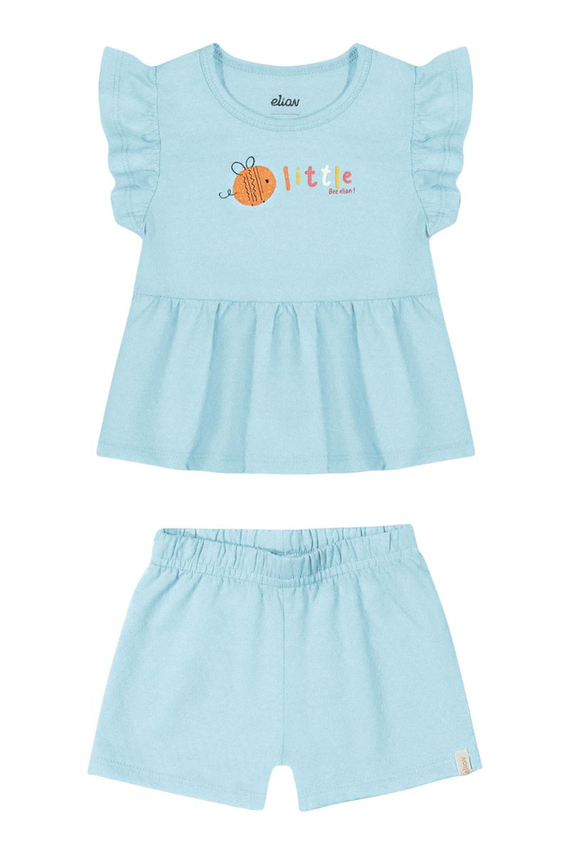 • Conjunto composto por blusa e short • Feito em cotton leve e malha texturizada • Possui mangas curtas com franzidos • Possui estampa de abelha com efeito puff e glitter • Possui elástico no cós • Ideal para passeios e momentos de lazer em família