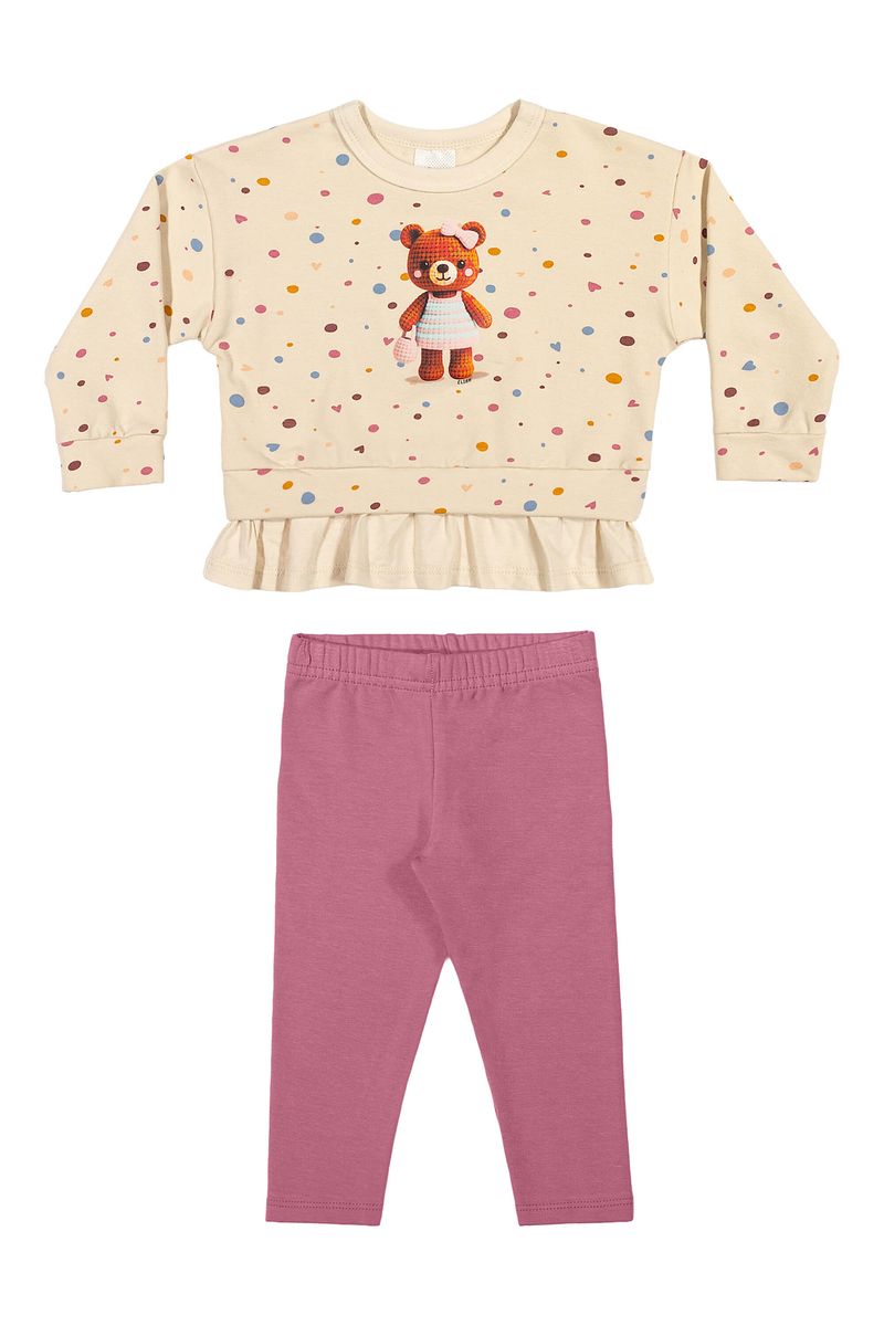 • Conjunto composto por blusão e calça legging • Feito em molecotton felpado e meia malha • Possui mangas longas com ombros deslocados • Estampa de poás e com uma ursinha • Detalhe de falsa sobreposição com babados • Elástico no cós • Ideal para passeios e momentos especiais