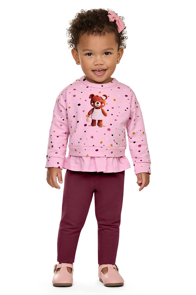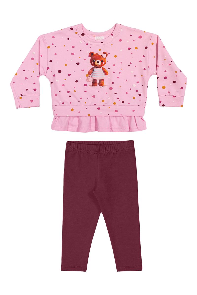 • Conjunto composto por blusão e calça legging • Feito em molecotton felpado e meia malha • Possui mangas longas com ombros deslocados • Estampa de poás e com uma ursinha • Detalhe de falsa sobreposição com babados • Elástico no cós • Ideal para passeios e momentos especiais