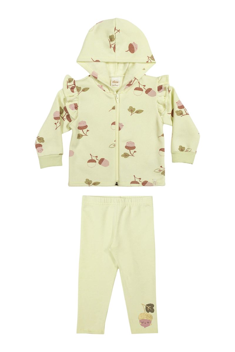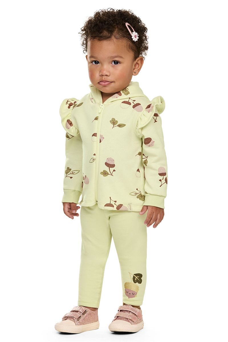 • Conjunto composto por jaqueta e calça legging • Feito em moletom felpado e molecotton felpado • Possui mangas longas com babados • Estampa de nozes com detalhes em puff e brilho • Abertura em zíper • Possui capuz • Elástico no cós • Ideal para passeios ao ar livre