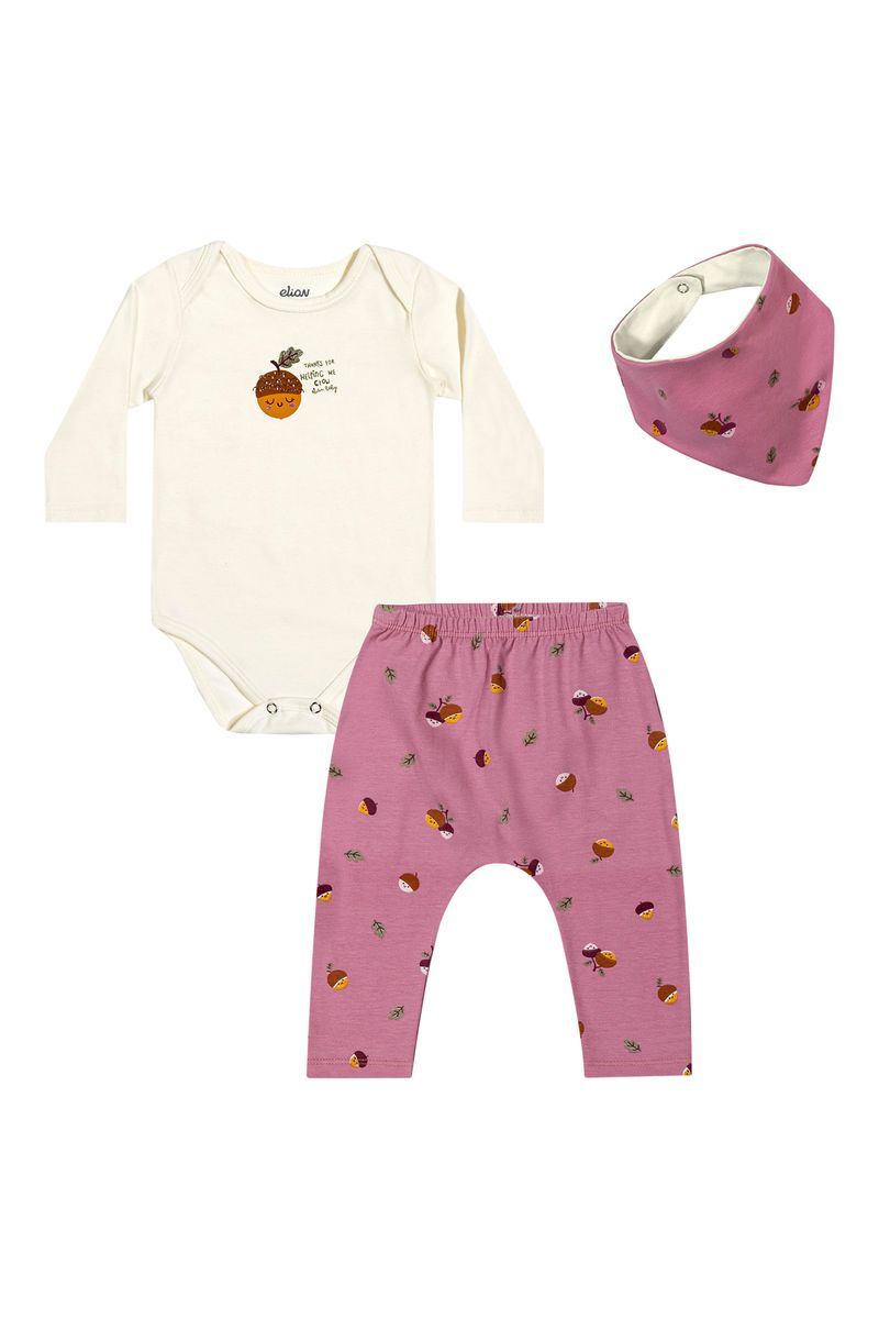 • Kit composto por body, calça e babador • Feito em cotton leve • Possui mangas longas • Possui estampa lúdica e detalhe em glitter • Abertura em botões de pressão • Elástico no cós • Ideal para momentos de cuidado, passeios ou descanso