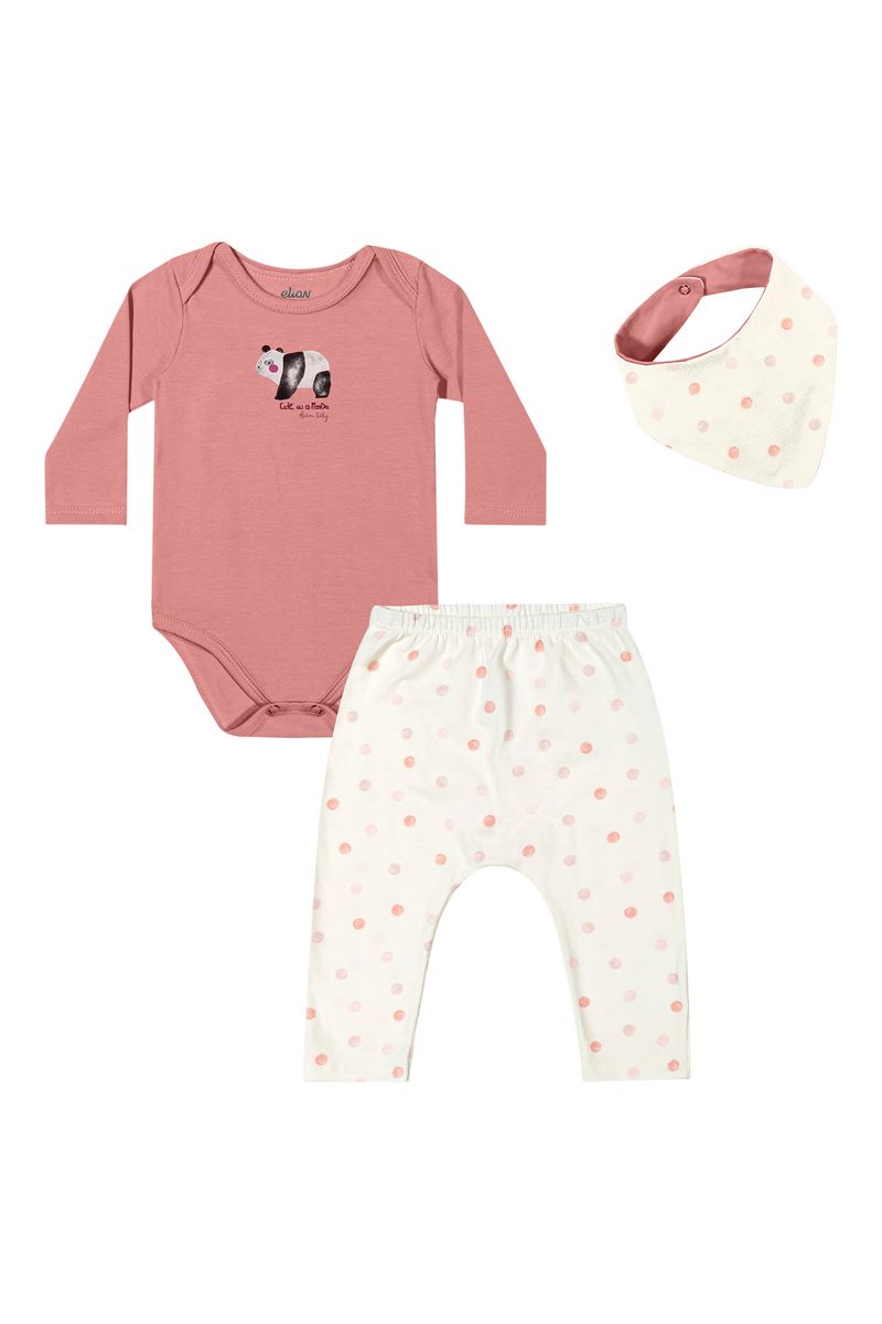 • Kit composto por body, calça e babador • Feito em cotton leve • Possui mangas longas • Possui estampa lúdica e detalhe em glitter • Abertura em botões de pressão • Elástico no cós • Ideal para momentos de cuidado, passeios ou descanso