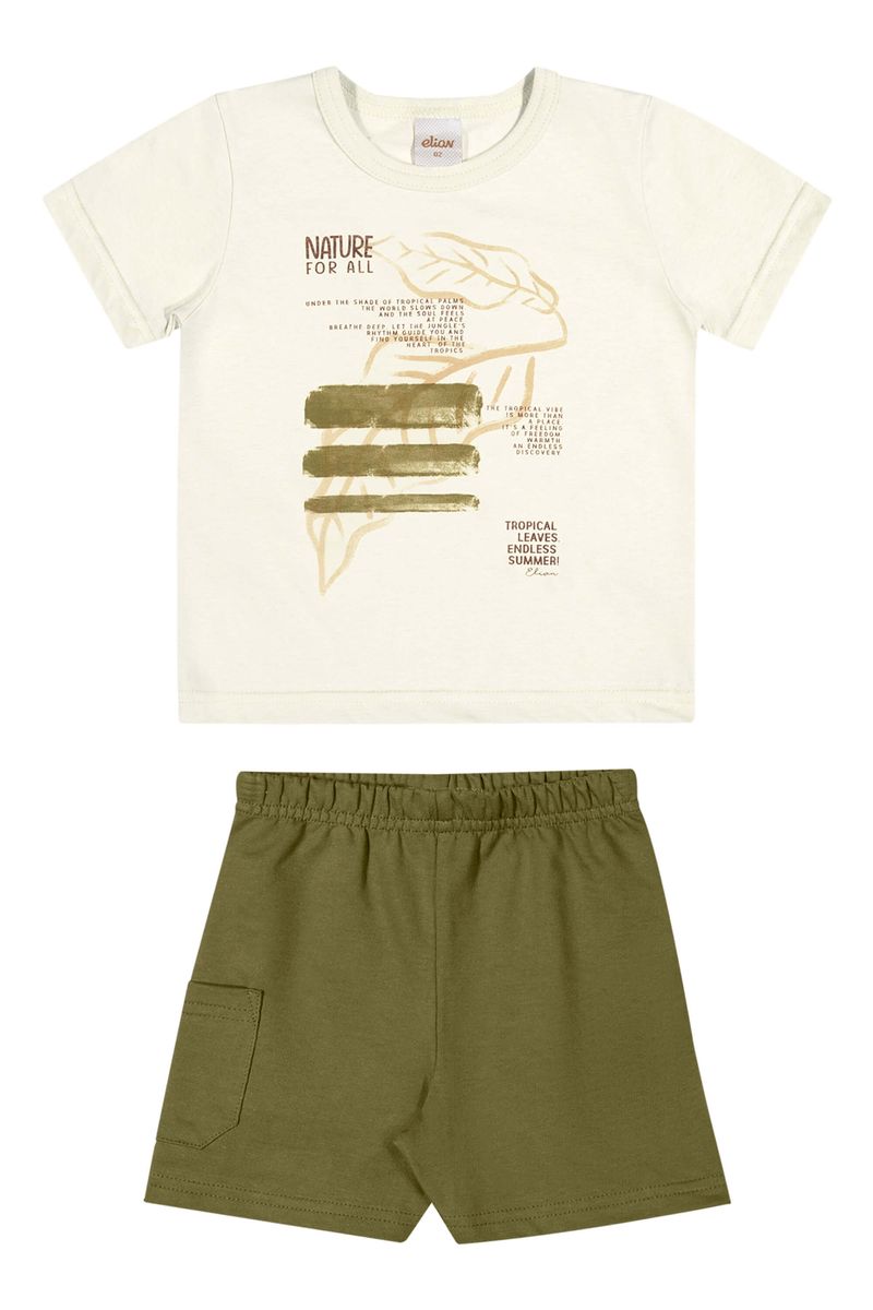 • Conjunto composto por camiseta e bermuda • Feito em meia malha e moletinho • Estampa com tema natureza • Elástico no cós • Possui bolso lateral • Ideal para brincadeiras e passeios
