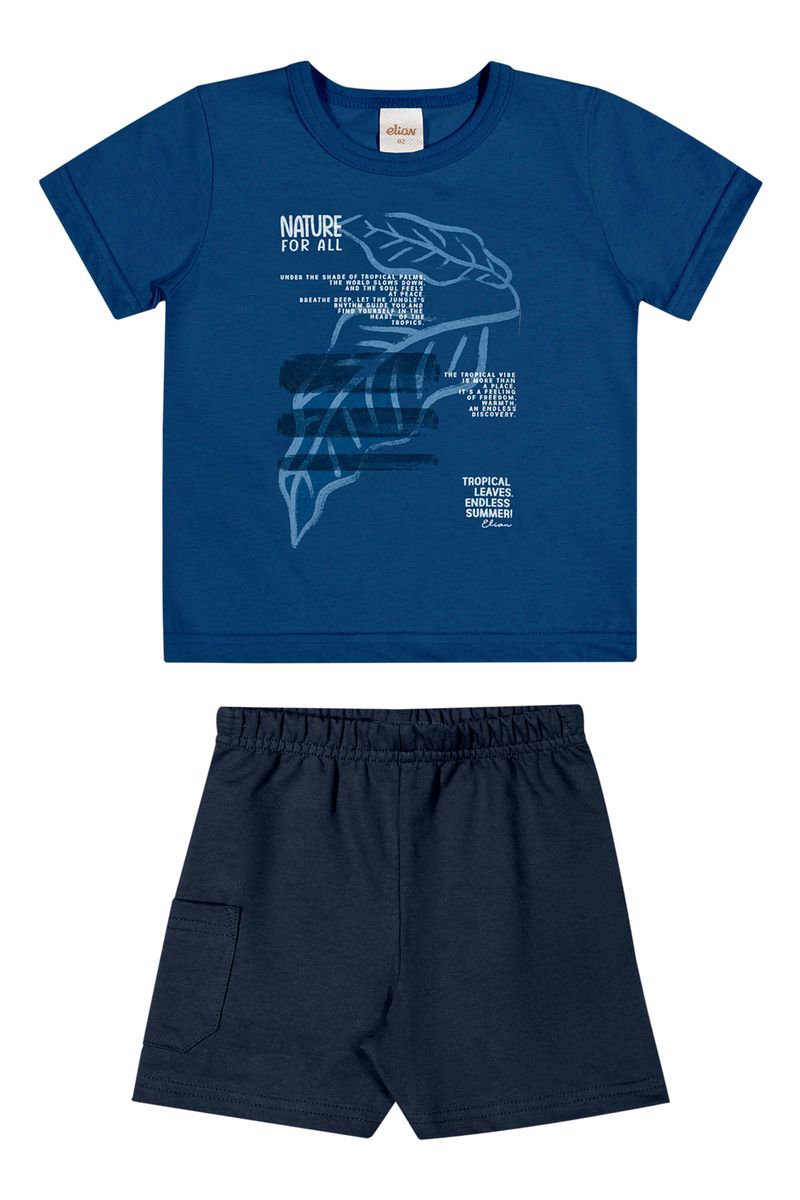 • Conjunto composto por camiseta e bermuda • Feito em meia malha e moletinho • Estampa com tema natureza • Elástico no cós • Possui bolso lateral • Ideal para brincadeiras e passeios