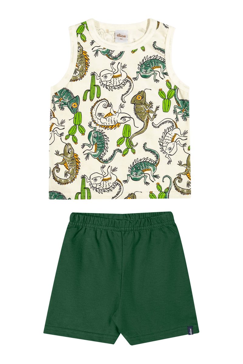 • Conjunto composto por regata e bermuda • Feito em meia malha e moletinho • Estampa com tema répteis • Elástico no cós • Ideal para brincar ao ar livre