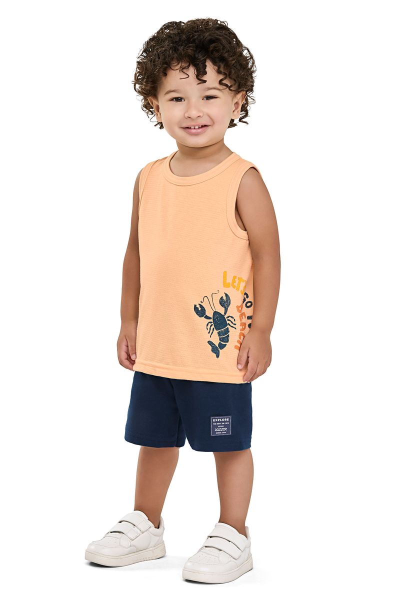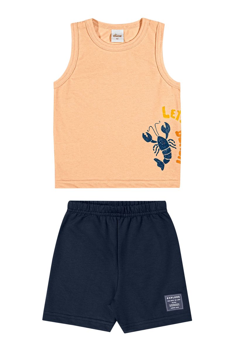 • Conjunto composto por regata e bermuda • Feito em malha trabalhada e moletinho • Estampa de lagostas • Elástico no cós • Ideal para dias de verão
