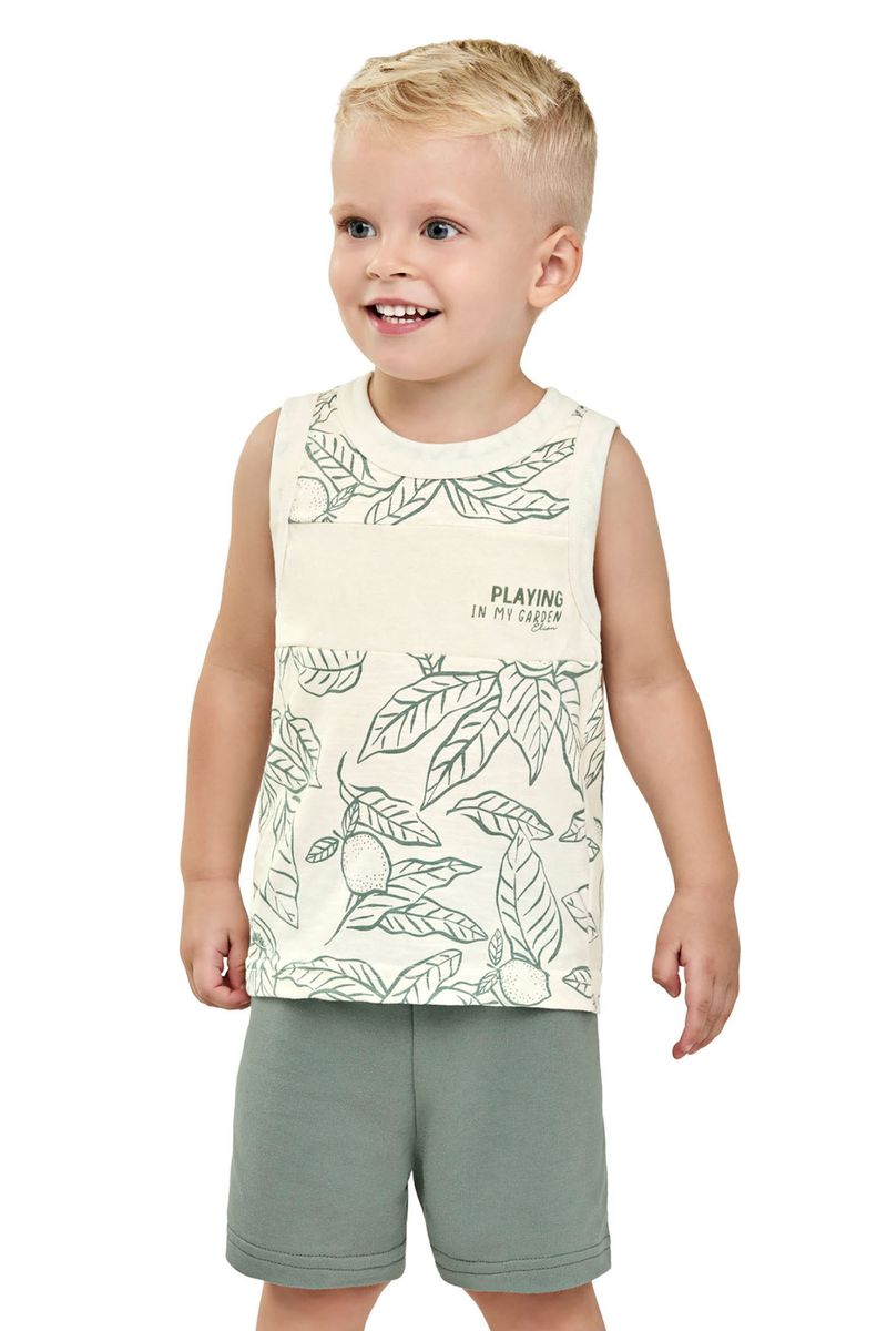 • Conjunto composto por regata e bermuda • Feito em malha flamê e moletinho • Estampa com tema natureza • Detalhe em recorte frontal • Elástico no cós • Ideal para dias de calor e aventuras ao ar livre