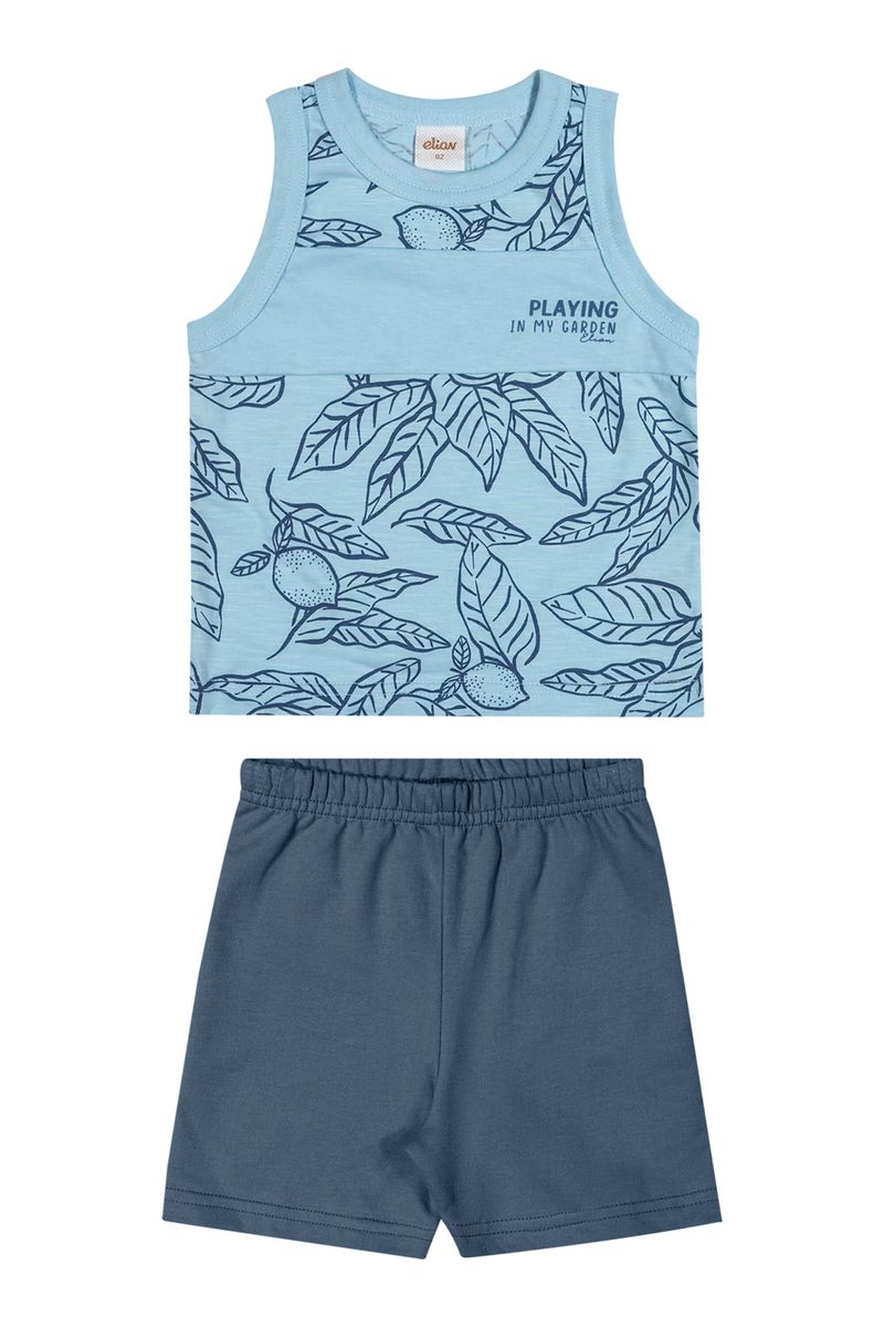 • Conjunto composto por regata e bermuda • Feito em malha flamê e moletinho • Estampa com tema natureza • Detalhe em recorte frontal • Elástico no cós • Ideal para dias de calor e aventuras ao ar livre
