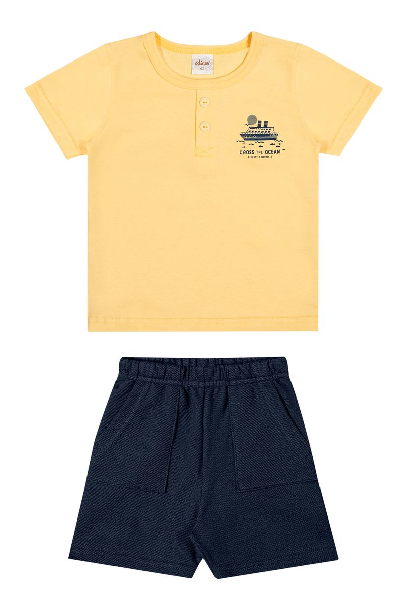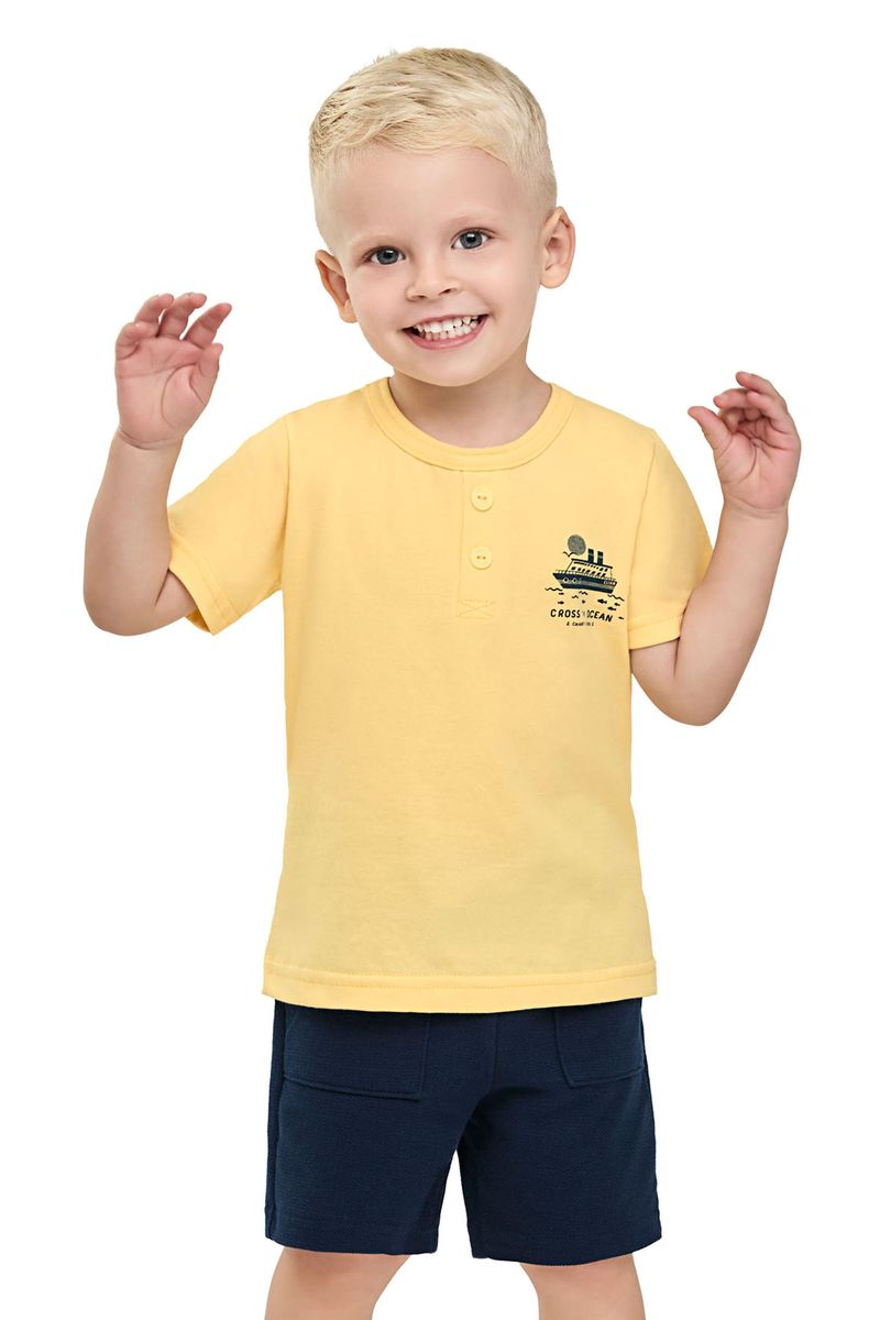 • Conjunto composto por camiseta e bermuda • Feito em meia malha e moletinho texturizado • Estampa de barco • Botões decorativos no peitilho • Elástico no cós • Possui bolsos • Ideal para passeios e momentos de lazer