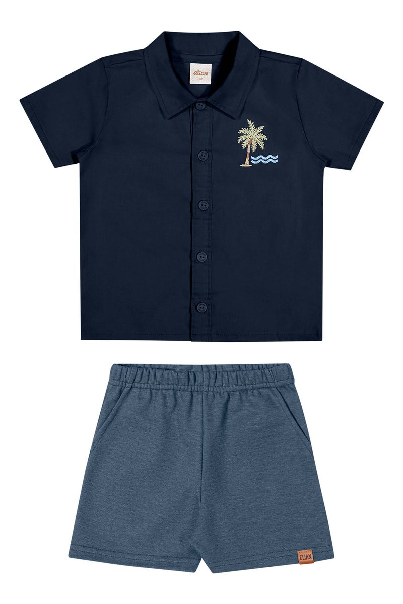 • Conjunto composto por camisa e bermuda • Feito em tecido tricoline com elastano e moletinho dublado • Abertura com botões • Possui bordado com temática de praia • Elástico no cós • Ideal para ocasiões especiais e passeios